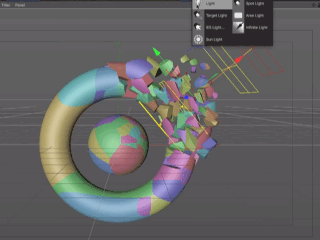 - 回転させ、下方向に移動。位置や減衰範囲を調整。オブジェクトの輪郭を浮き上がらせるようなライティングになるようにする。