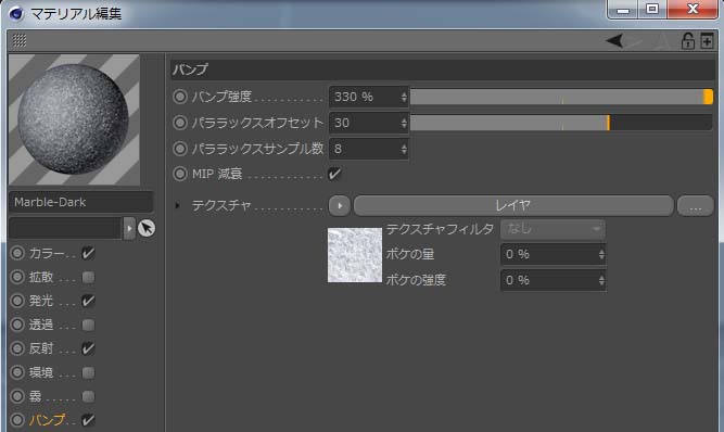 凹凸を強めにしたい。[バンプ]チャンネルで、テクスチャにさきほどのテクスチャをペーストして、「強さ Stength」の値をあげる。「330%」に。[パララックスオフセット]を「30」に。