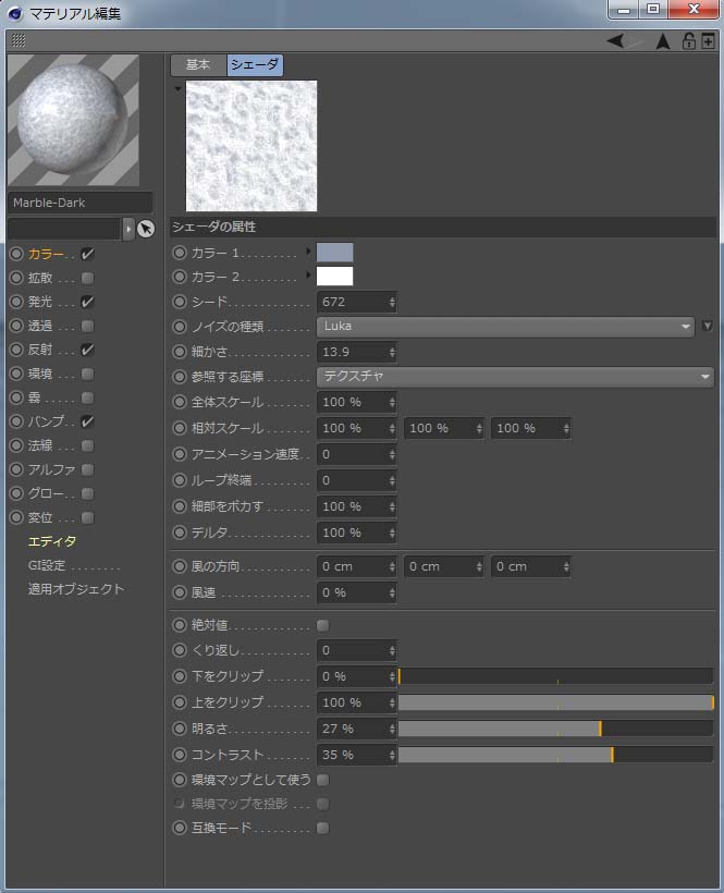 - 名前を「Marble -Dark」とする。シェーダの編集していく。