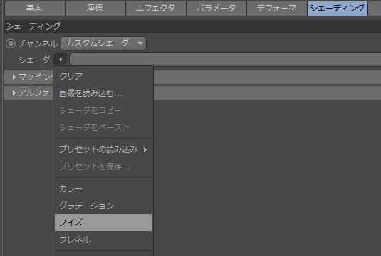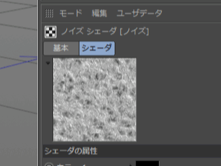 - [シェーディング]タブの[シェーダ]より「ノイズ」を読み込む。