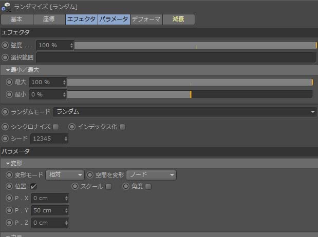 - [エフェクタ Effector]タブの[最大Maximum/最小Minimum]で、最小を「0%」に。(「-100%」のままだとP.Y.が「-50cm」~「50cm」の間でランダムとなる)