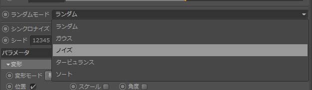 - [エフェクタ]タブの[ランダムモード]で「ランダム Random」、「ガウスGaussian」(ランダムよりもやや低い値)、「ソート」だとクローナーはアニメートされない。※[シード]にキーフレームアニメーションを適用すれば、アニメーションは可能