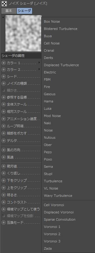[ノイズの種類]が多いことがシェーダエフェクタを使う利点であることがわかる。