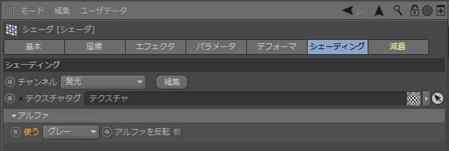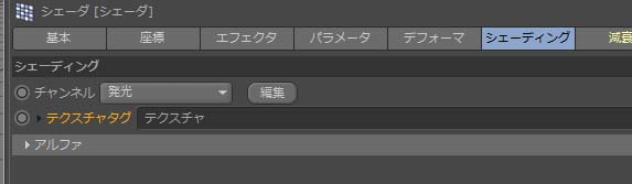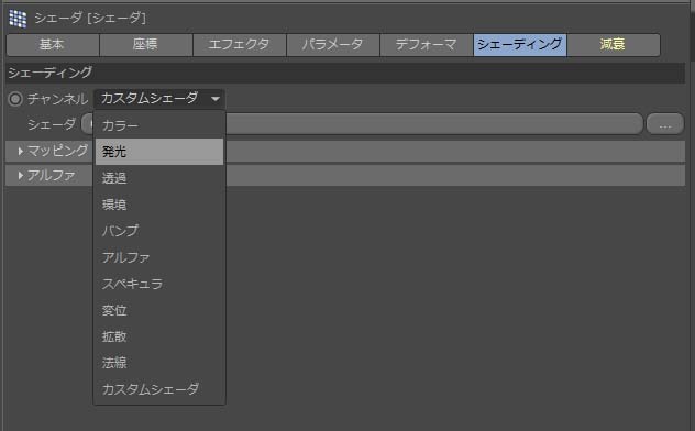 - 発光チャンネルでシェーダエフェクタを操作したい。[シェーディング]タブの[チャンネル Channnel]で、「発光」を選択。