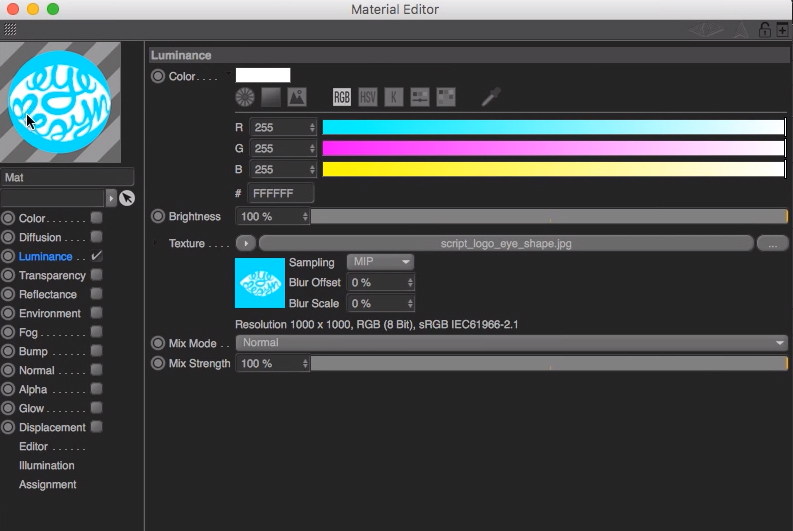 - 新規マテリアル作成。[発光]チャンネルのテクスチャにロゴ画像を読み込む