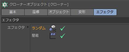 - まずエフェクタのかかる順番を、ランダムエフェクタが適用されたあとに、簡易エフェクタが適用されるように、クローナーの[エフェクタ]タブでエフェクタの順番を変更する。